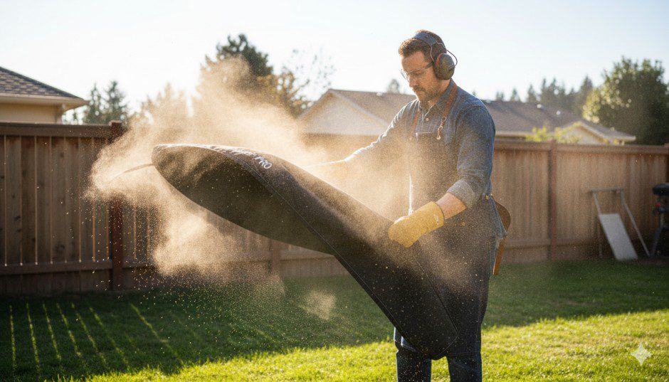 For light dust, shake the cover vigorously outside or vacuum with a brush attachment. For embedded dust, machine wash on gentle cycle with cold water (check manufacturer instructions first), or hand wash with mild detergent and air dry completely. Never use hot water or machine dryers as heat damages water-resistant coatings. Clean covers quarterly for shop use, monthly for job site applications.