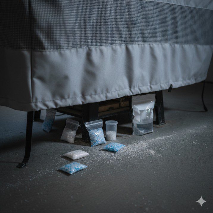 For enclosed storage (under covers or in cabinets), place desiccant near vulnerable metal surfaces. Rechargeable versions (available on Amazon for $15-$25) can be regenerated hundreds of times by heating in an oven.