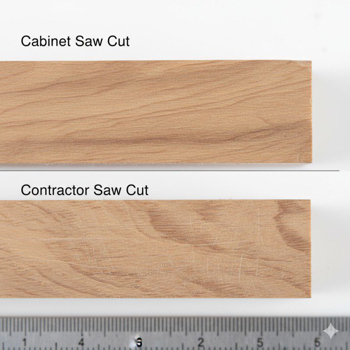 Standard table saws, with their lighter construction and direct-drive or belt-drive systems mounted externally, produce noticeably more vibration. You’ll see this in the cut quality, especially on crosscuts and when working with figured woods. The vibration shows up as slight blade marks that require additional cleanup work.
