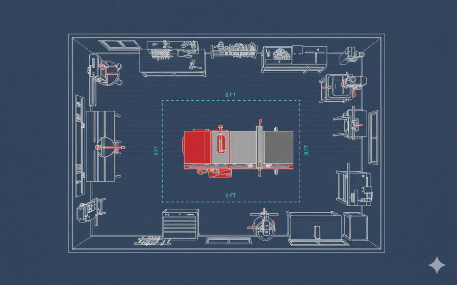 Plan for at least 8 feet by 6 feet of floor space to accommodate the saw and provide adequate working clearance on all sides. You’ll need additional space for infeed and outfeed support when processing long stock. Many woodworkers position cabinet saws centrally in their shops to allow workflow from all directions.