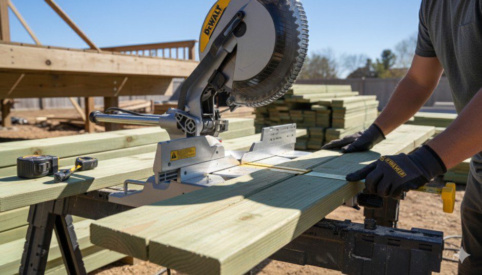 Miter saws produce wood dust—which OSHA classifies as a respiratory hazard. Treated lumber adds arsenic and copper compounds.