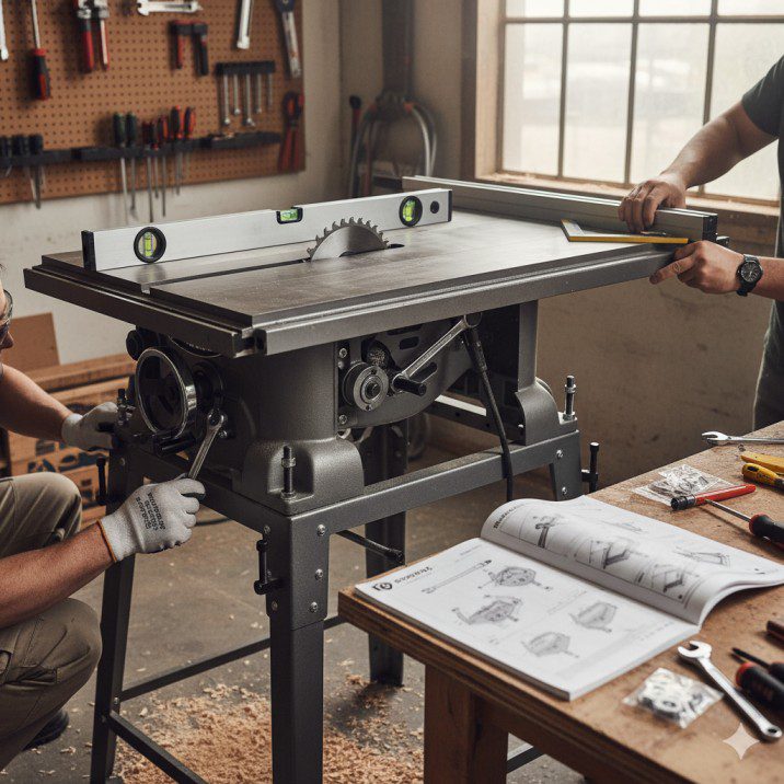 Follow manufacturer assembly instructions carefully. Most contractor saws arrive partially assembled—you’ll attach legs or stands, install table wings, and mount the fence rail.