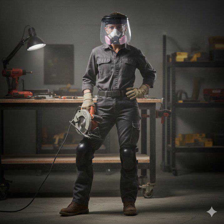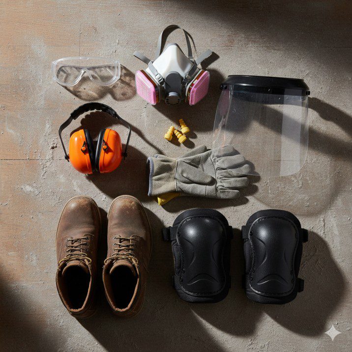 Respirator, eye protection, hearing protection, gloves, boots. Do this before you make any cuts. No exceptions, no “just this one quick cut” without protection.
