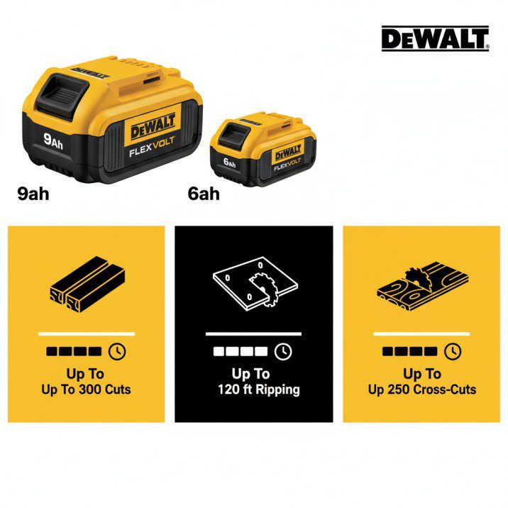 | 6Ah FlexVolt | 3/4″ plywood rips (8′) | 30-35 minutes | 40-50 linear feet |
