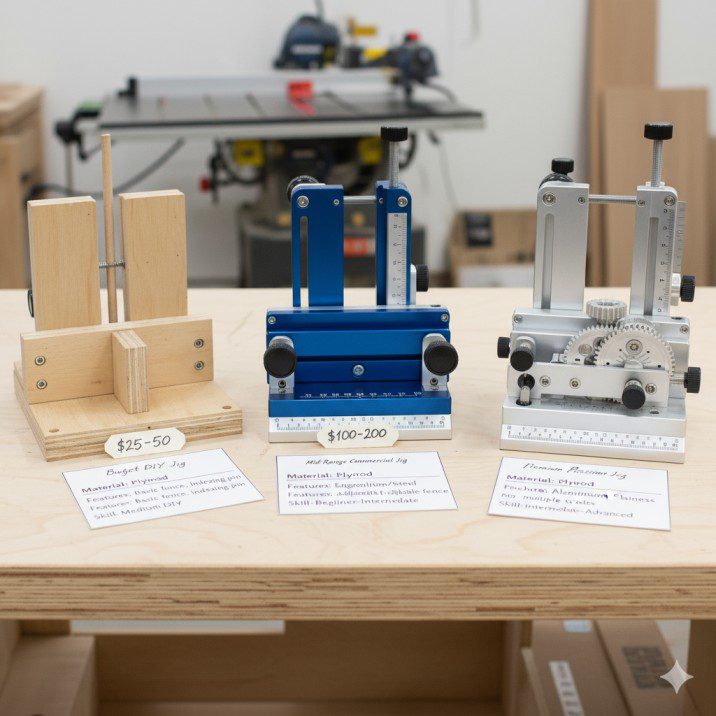 High-end manufactured jigs like the Incra I-Box or Woodhaven systems offer micro-adjustability and can accommodate various blade widths.