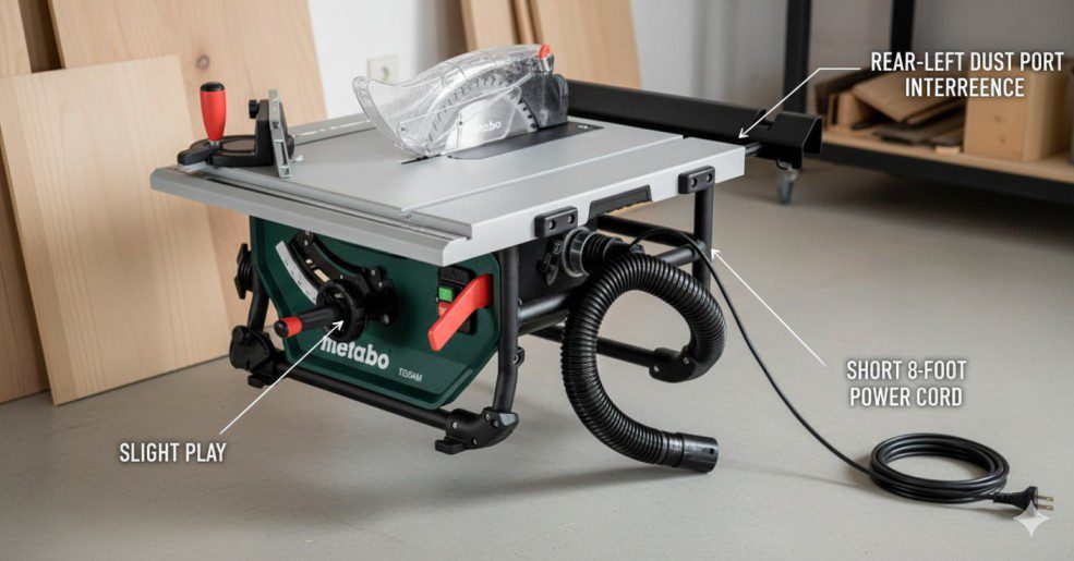 Dust Port Location: The 4″ port exits at the rear-left of the saw, which interferes with some shop vacuum hose configurations. I had to modify my dust collection routing to prevent the hose from kinking. A side-exit port would offer more flexibility.