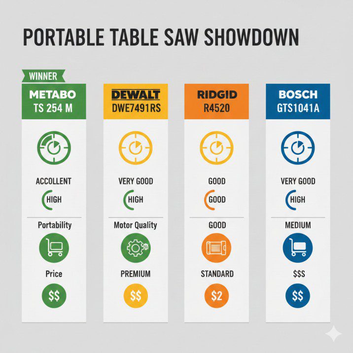 The Metabo lands in the value sweet spot if you prioritize cut accuracy over brand recognition. If flesh-sensing safety is non-negotiable, allocate budget for SawStop. If you need maximum portability, the DeWalt’s stand design wins.