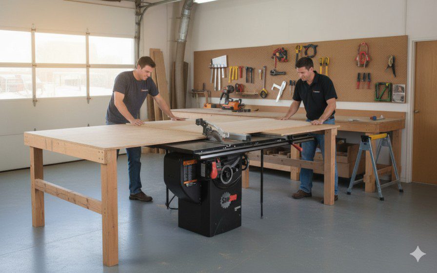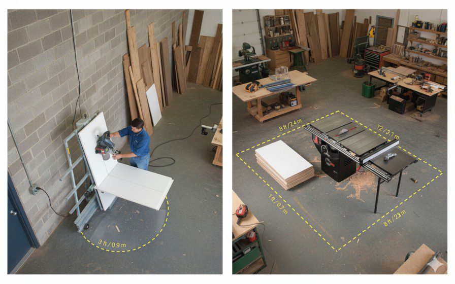 Space requirements multiply. That “60-inch” table saw actually needs 12-15 feet of clear space front-to-back when you account for infeed and outfeed support for long rips. Add side clearance for sheet goods and you’re looking at substantial floor space.