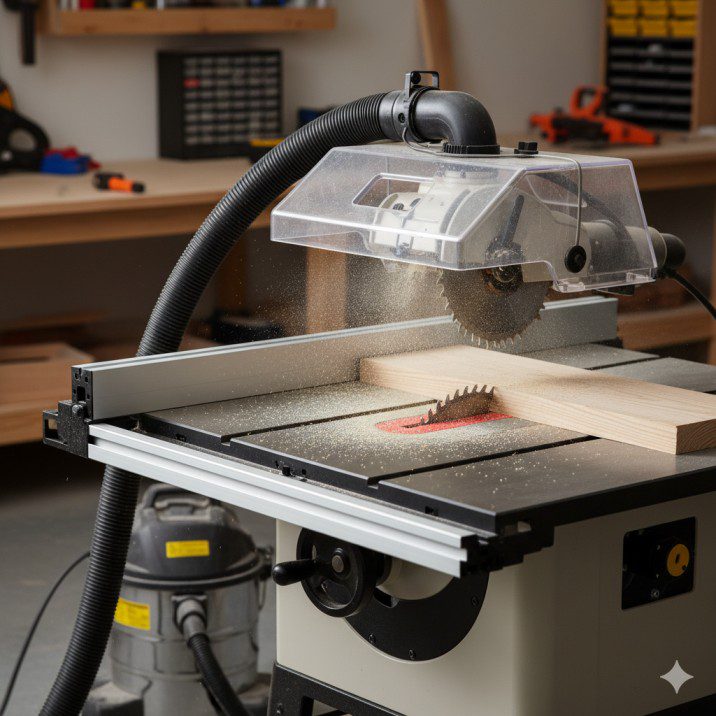 Push sticks and featherboards are equally critical—push sticks keep your hands away from the blade, while featherboards prevent kickback by maintaining workpiece pressure. Never make a cut that brings your hands within 6″ of the blade without using push sticks. Keep featherboards mounted for all ripping operations.