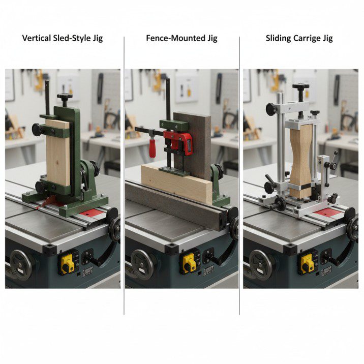 These jigs ride in your miter slot, positioning the workpiece vertically in front of the blade. The most common design features a vertical clamping surface mounted to a sled base that slides through the cut.
