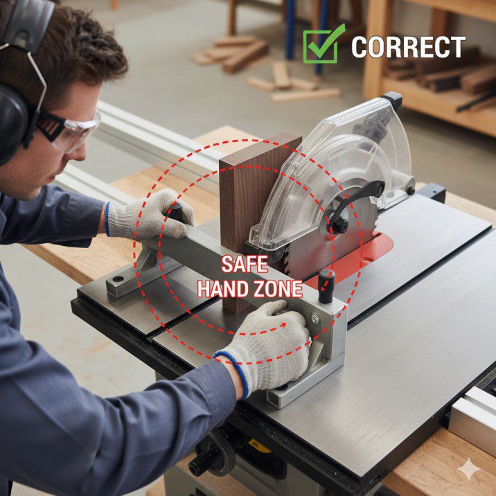 Many beginners (myself included years ago) attempt vertical cuts using only a miter gauge and careful hand pressure. This approach has serious limitations: